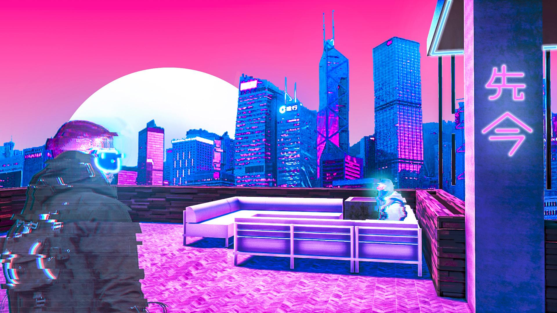 In order to create the characters, stock images of people using “Tech wear” clothes were used, further editing them to create the glitches in order to indicate that the landscape seen in the images is not reality.