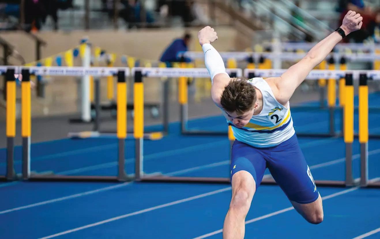 Senior athlete Ryan Benson competes in the hurdles on Jan.24 during the Jim Emmerich Alumni Meet.