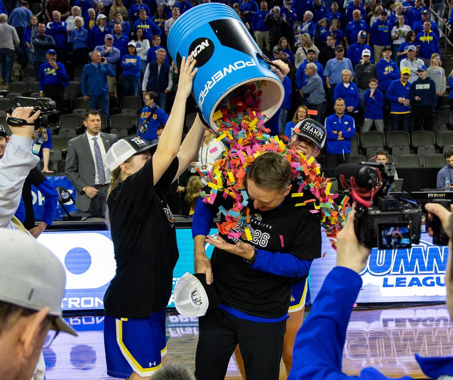 The Jackrabbit women’s basketball team celebrates winning the Summit League Tournament on Sunday, March 8. Senior Brooklyn Meyer holds the Summit League trophy surrounded by her teammates (left). The SDSU team hoists the Summit League Trophy (middle). Senior Ellie Colbeck and Hilary Behrens poor confetti on head coach Aaron Johnston (right).