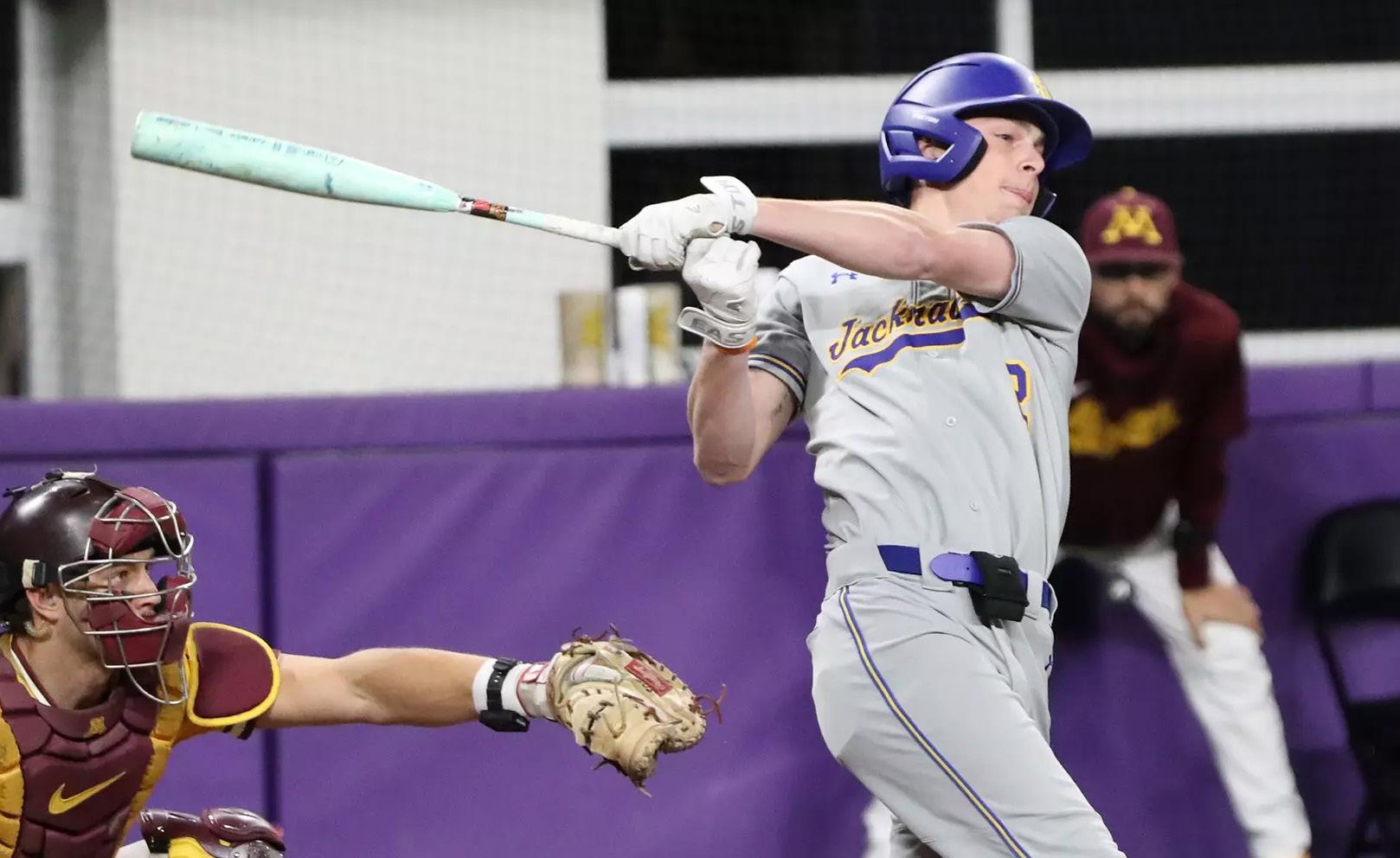 Nolan Grawe swings the bat in a baseball game against the University of Minnesota in Minneapolis on March 5, 2026. Grawe had three hits, accounting for a third of SDSU’s total hits that game while also registering an RBI.