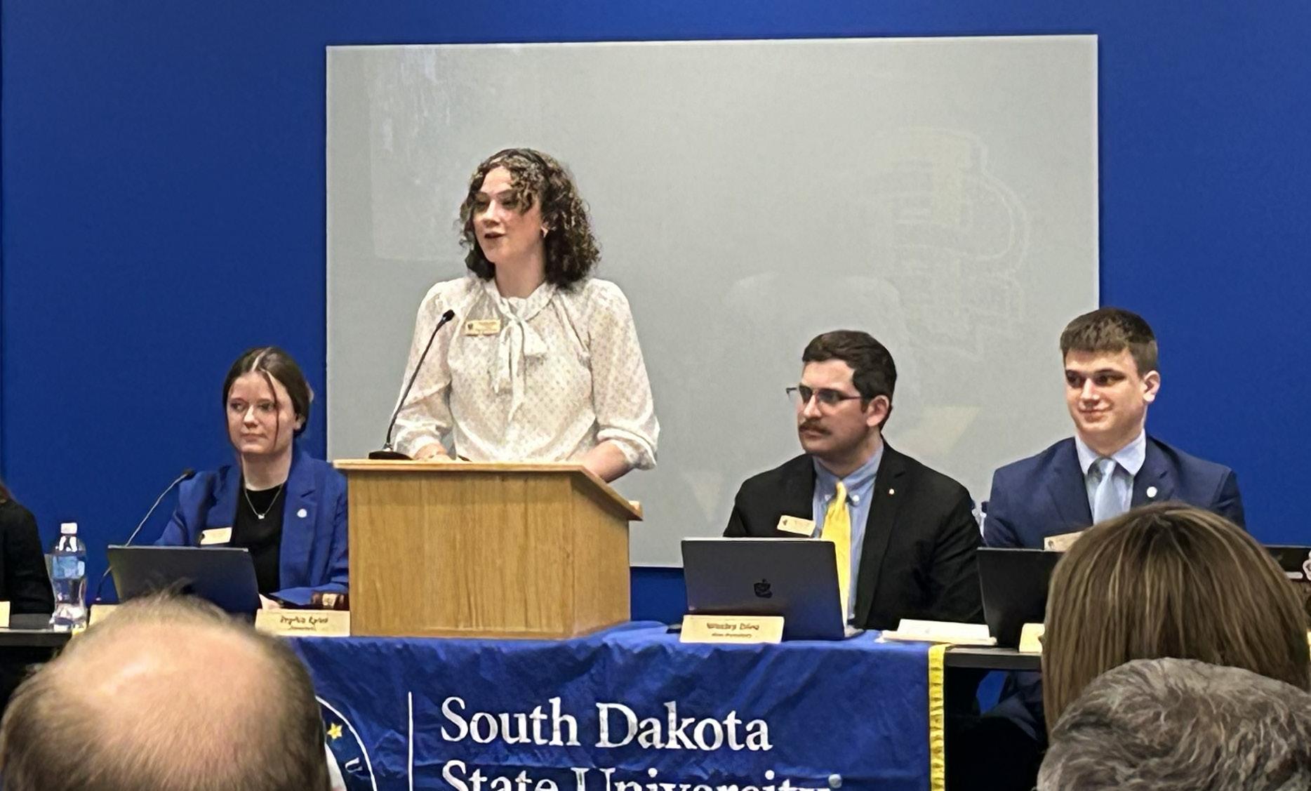 Students’ Association President Sophie Spier speaks at the Monday night meeting in the Lewis and Clark Room in the Student Union, in Brookings, SD.