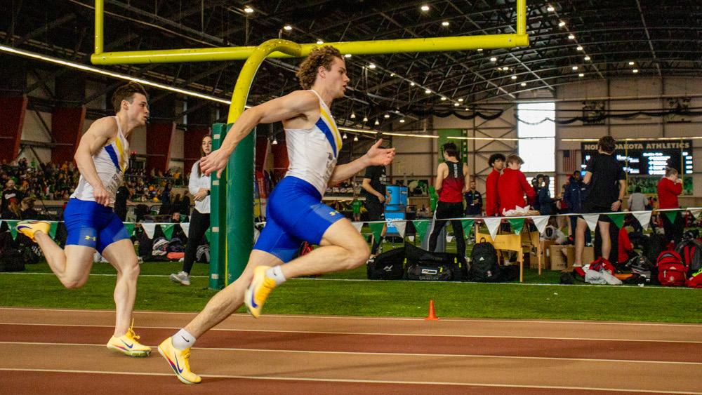 Griffin Fischer runs past a teammate at the Summit League Indoor Track and Field Championship at the Frederick D. Pollard Jr. Athletic Center in Grand Forks, N.D. Fischer placed third in 200 meter.