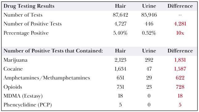 The study also found that hair tests yielded more positive drug tests across all drugs for every age group and every state.