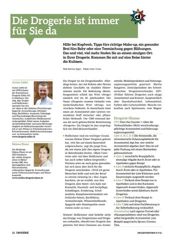 Ein Drogist ist ein Drogenhändler. Aller dings keiner, der mit Kokain oder Heroin dubiose Geschäfte im dunklen Hinter zimmer macht. Die Bedeutung «Betäu bungs mittel» erhielt das Wort «Droge» nämlich erst im 20. Jahrhundert. Der Name «Drogerie» stammt vielmehr vom niederländischen Wort «droog», was «trocken» bedeutet. Es bezeichnete einst einen als Arzneimittel oder Gewürz ver wendeten Stoff tierischer oder pflanz licher Herkunft. Um 1500 entstand dar aus die noch gebräuchliche Bezeichnung «Drogerie». Ein Drogist ist also ursprüng lich ein (Heil-)Kräuterhändler. Heilkräuter sind ein wichtiger Grund, warum Helene Elmer Drogistin gelernt hat. «Ich bin auf einem Bauernhof aufgewachsen», sagt die junge Frau, die seit einem Jahr ihre eigene Drogerie in Bätterkinden besitzt. «Mein Vater weiss sehr viel über Heilkräuter und hat auch selber Salben hergestellt.» Floristin wäre sie auch gerne geworden, hat sich dann aber doch für die Drogerie entschieden. «Weil ich gerne Menschen helfe und weil der Beruf so extrem vielseitig ist.» Ihre Augen leuchten, als sie erzählt, was ihre Drogerie alles bietet: «Ich habe mit Kosmetik, Haushalt- und Sachpflege, Schädlingen, Ernährung, Schul medizin, Komplementärmedizin wie Schüssler-Salzen, Bachblüten, Aromatherapie, Pflanzenheilkunde, Spagyrik oder Homöopathie sowie vielem mehr zu tun.» Stimmt! Heilkräuter sind beileibe nicht das Einzige, was Drogistinnen und Drogis ten verkaufen, obwohl eine Drogerie den grössten Teil ihres Umsatzes aus Arznei