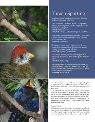 trees. They mostly run along tree branches, using their long tail to stay balanced, and hop between high and low branches. To move to a more distant tree, a turaco switches to “flap-flap-glide” flying mode. In addition to that long tail, the turaco has another unique adaptation afoot—literally! Like many birds, a turaco has four toes on each foot: three forward-facing and one rear-facing. The outermost front toe can be rotated to the rear to give the bird a more secure grip on a branch. This extra anchoring ability allows a turaco to access food in a variety of ways—even while hanging upside down!