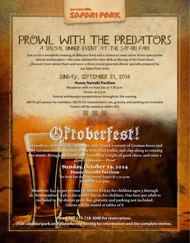 Prowl with the Predators A Special Dinner Event at the Safari Park Join us for a wonderful evening of delicious food and a chance to meet some of our spectacular animal ambassadors—the ones admired for their skills at the top of the food chain! Discover more about them and savor a three-course gourmet dinner specially prepared by our Safari Park chefs.
