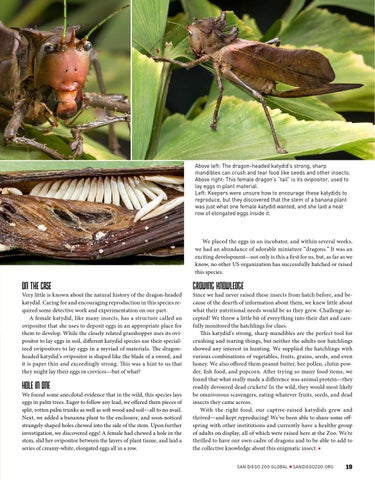 Above left: The dragon-headed katydid’s strong, sharp mandibles can crush and tear food like seeds and other insects. Above right: This female dragon’s “tail” is its ovipositor, used to lay eggs in plant material. Left: Keepers were unsure how to encourage these katydids to reproduce, but they discovered that the stem of a banana plant was just what one female katydid wanted, and she laid a neat row of elongated eggs inside it.