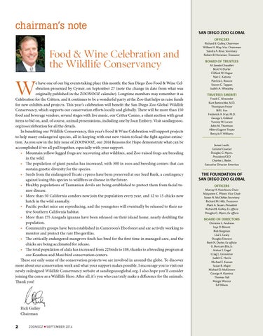 e have one of our big events taking place this month: the San Diego Zoo Food & Wine Celebration presented by Cymer, on September 27 (note the change in date from what was originally published in the ZOONOOZ calendar). Longtime members may remember it as Celebration for the Critters, and it continues to be a wonderful party at the Zoo that helps us raise funds for new exhibits and projects. This year’s celebration will benefit the San Diego Zoo Global Wildlife Conservancy, which supports our conservation efforts locally and globally. There will be more than 150 food and beverage vendors, several stages with live music, our Critter Casino, a silent auction with great items to bid on, and, of course, animal presentations, including one by Joan Embery. Visit sandiegozoo. org/zoo/celebration for all the details. In benefiting our Wildlife Conservancy, this year’s Food & Wine Celebration will support projects to help many endangered species, all in keeping with our new vision to lead the fight against extinction. As you saw in the July issue of ZOONOOZ, our 2014 Reasons for Hope demonstrate what can be accomplished if we all pull together, especially with your support. • Mountain yellow-legged frogs are recovering after wildfires, and Zoo-raised frogs are breeding in the wild. • The population of giant pandas has increased, with 300 in zoos and breeding centers that can sustain genetic diversity for the species. • Seeds from the endangered Tecate cypress have been preserved at our Seed Bank, a contingency against losing this species to wildfires or disease in the future. • Healthy populations of Tasmanian devils are being established to protect them from facial tumor disease. • More than 50 California condors now join the population every year, and 12 to 15 chicks now hatch in the wild annually. • Pacific pocket mice are reproducing, and the youngsters will eventually be released to their native Southern California habitat. • More than 175 Anegada iguanas have been released on their island home, nearly doubling the population. • Community groups have been established in Cameroon’s Ebo forest and are actively working to monitor and protect the rare Ebo gorillas. • The critically endangered mangrove finch has bred for the first time in managed care, and the chicks are being acclimated for release. • The total population of alala has increased from 22 birds to 108, thanks to a breeding program at our Keauhou and Maui bird conservation centers. These are only some of the conservation projects we are involved in around the globe. To discover more about our conservation work and what your support makes possible, I encourage you to visit our newly redesigned Wildlife Conservancy website at sandiegozooglobal.org. I also hope you’ll consider joining the cause as a Wildlife Hero. After all, it’s you who can truly make a difference for the animals. Thank you!