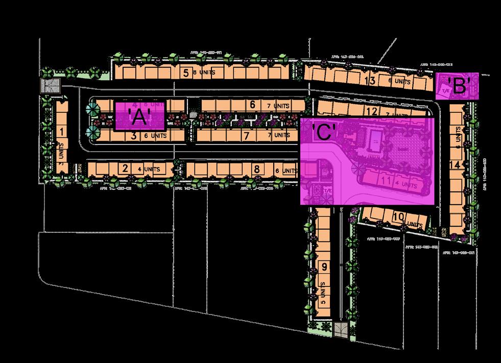 The relationship of building and landscape helps provide a place of comfort for a community to thrive in. Comfort through refuge provided by screening trees and places of prospect by the active/passive amenities of the site.