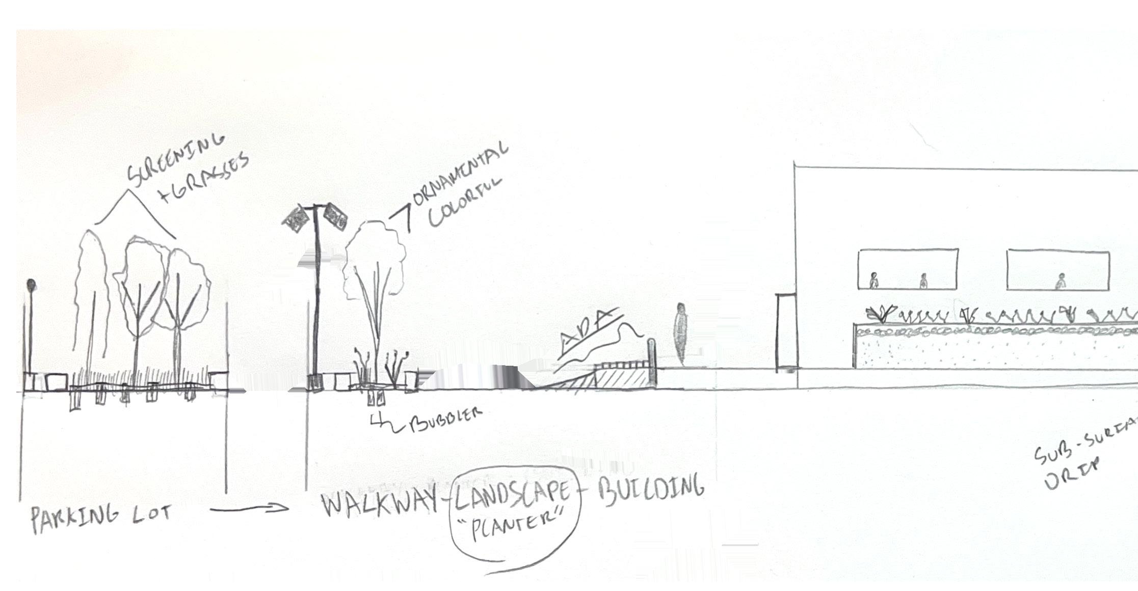My role in this project was to develop the planting placement and irrigation design with their corresponding details/calculations. At the start of this project, I researched site specific design guidelines and approved plant lists. With these tools I selected and presented recommendations later incorporated into the project.