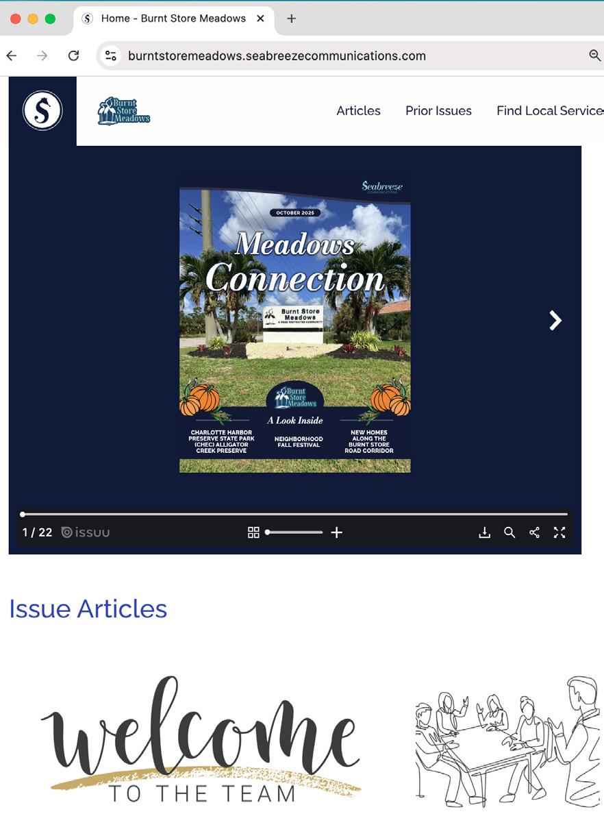 We are pleased to present another issue of the Meadows Connection newsletter. Beginning with our April 2025 edition, the Burnt Store Meadows Property Owners Association, in collaboration with our publisher, Seabreeze Communications, launched a dedicated website for the Meadows Connection monthly newsletter.
