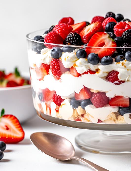 2. In a trifle bowl, layer cake cubes, cream, and berries.