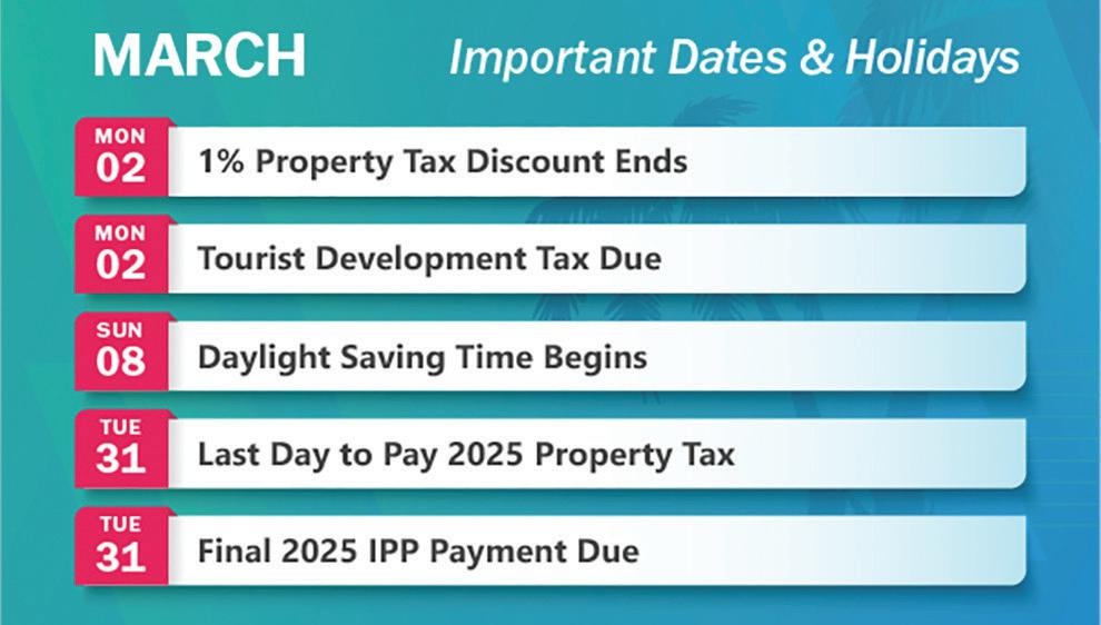 TDT: Tourist development tax is required of anyone offering accommodation for short-term rental of six months or less. Also known as “bed tax,” and applies to all hotels, motels, accommodations, and privately-owned homes listed for shortterm rental. For more information visit www.pbctax.gov/taxes/ tourist-development-tax/.