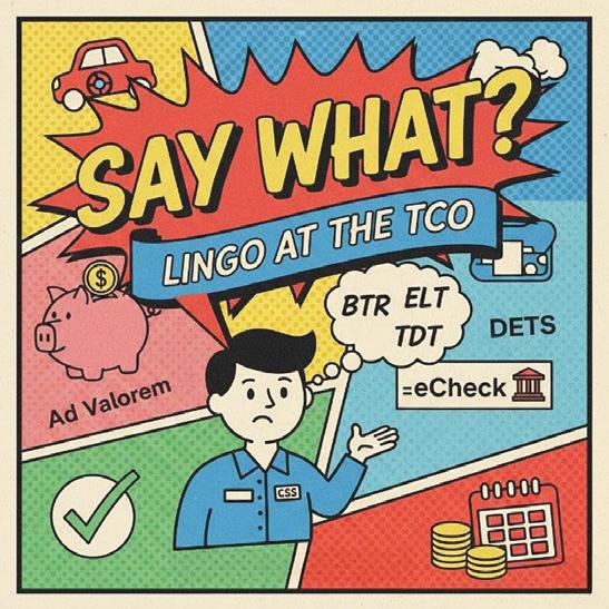 At the TCO, you will hear our staff using numerous acronyms and phrases for terms associated with our services, for example, TCO is tax collector’s office. To help you, here are some common terms you might hear the staff speaking “the lingo” during your interaction with us.