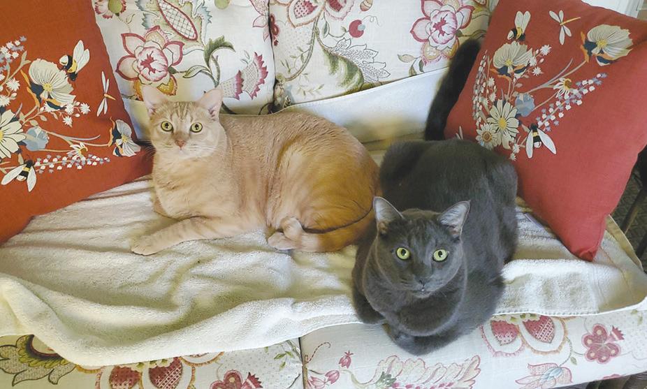 In the beginning, Smokey and Simba stayed hidden beneath the bed, coming out only for food and water. Slowly, trust grew. Smokey, whom Gail believes may be a Russian Blue, is intelligent and cautious—and remarkably skilled at opening cabinets and doors. Simba, a 17-pound orange tabby with a mischievous streak, is bold and affectionate, greeting visitors and inspecting grocery bags with enthusiasm.