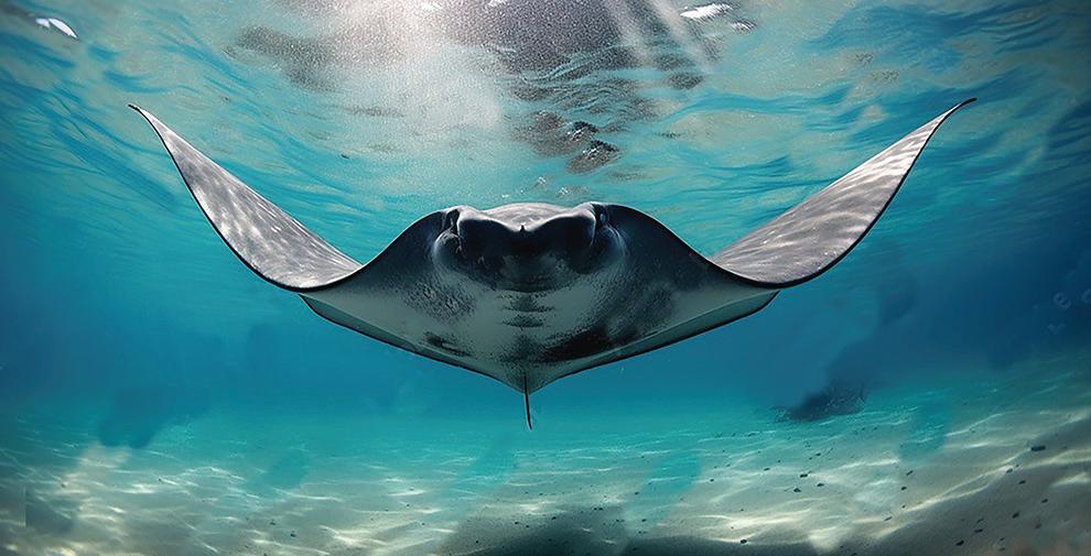 Rays are found globally mostly in tropical and subtropical waters. Cartilage instead of a backbone, they can move effortlessly. Their fins or “wings” allow Rays to “fly” through the water and sometimes literally become airborne. Rays are not aggressive but when startled they will whip their tail as a defense. Wading in shallow water, people should shuffle their feet to prevent stepping on a buried stingray.
