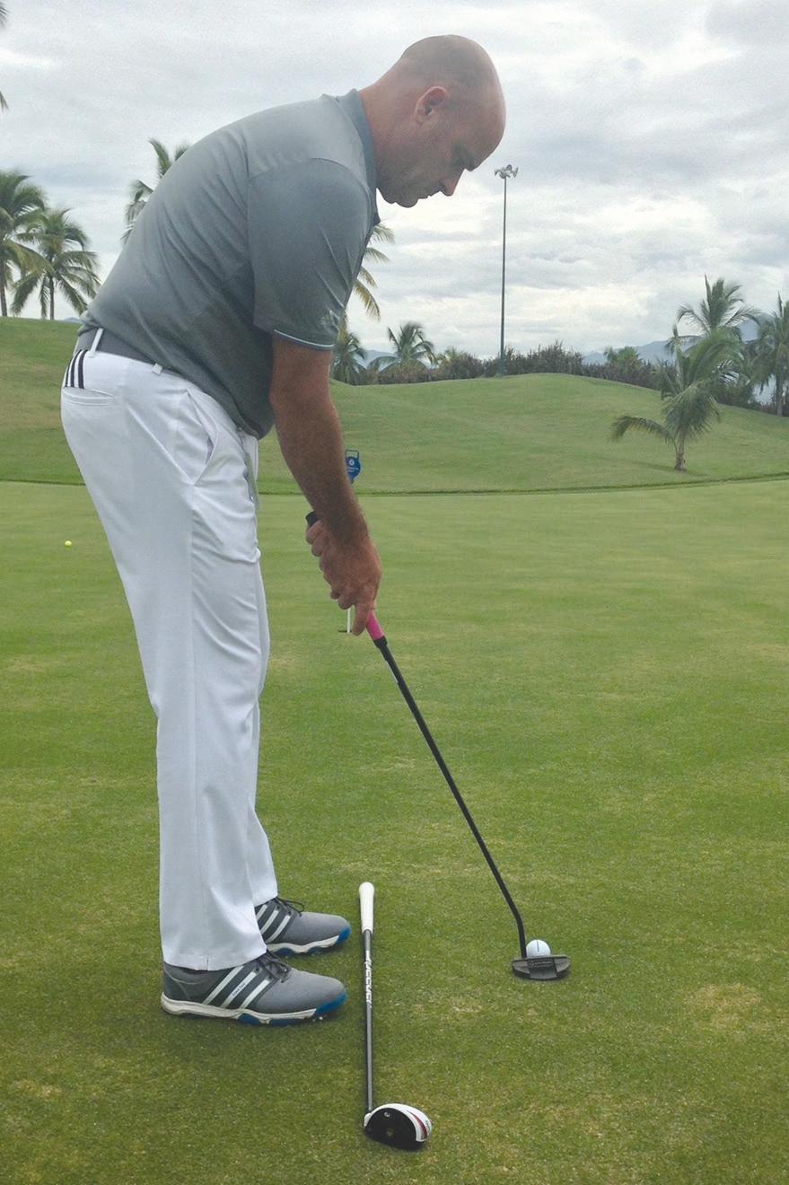 First, set the putter in line with the ball’s stripe and visualize a line running from your target through the ball, this will be the right rail of the train track that you will use to set up your body. Next, using the train track idea, set the feet parallel to the right rail of the track as seen in the photo. This will allow you to set the rest of the body up in the correct position so the ball can begin on the chosen starting line as much as possible.