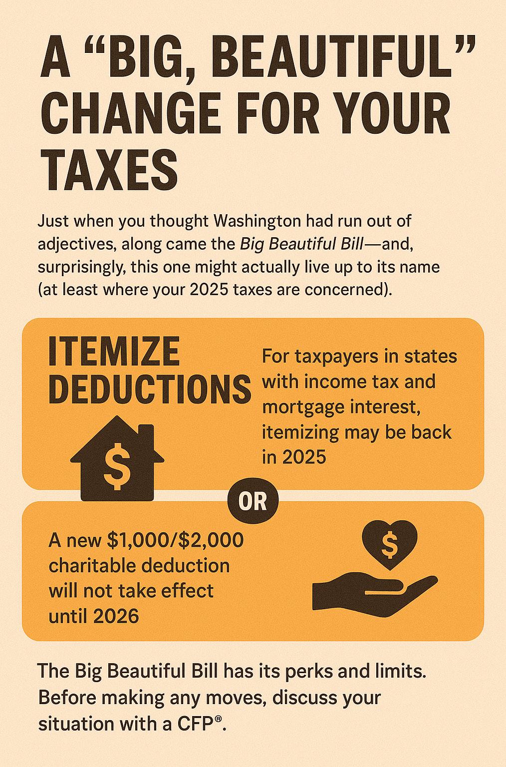 The Big Beautiful Bill may not make your tax return beautiful, but it could make it more interesting. If you’ve been defaulting to the standard deduction year after year, it’s time to take a fresh look at whether itemizing could save you money—or whether the new charitable deduction could enhance your giving in a tax-smart way.