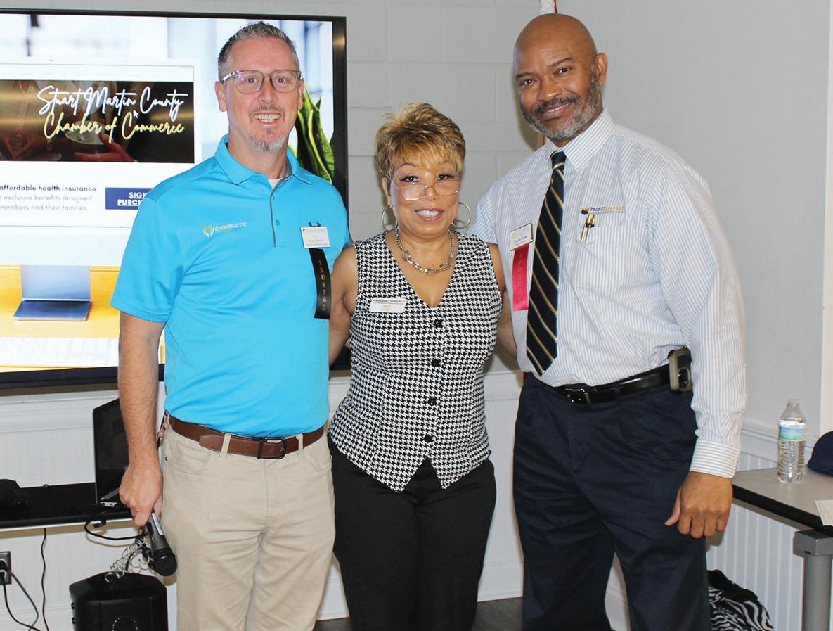 As sponsor of the Stuart/Martin County Chamber’s Jan. 13 Business B4 Breakfast at 10th Street Community Center, Ambassador Margaret Winfield, AYG Insurance and Financial Services, gave an informative presentation on the specialized group insurance program she is offering to chamber members. Offering Margaret support during her presentation were Chamber Chairman/Trustee Dr. Brian Moriarty, Loving Chiropractic of Stuart (left), and her colleague Dr. Joe Webb.