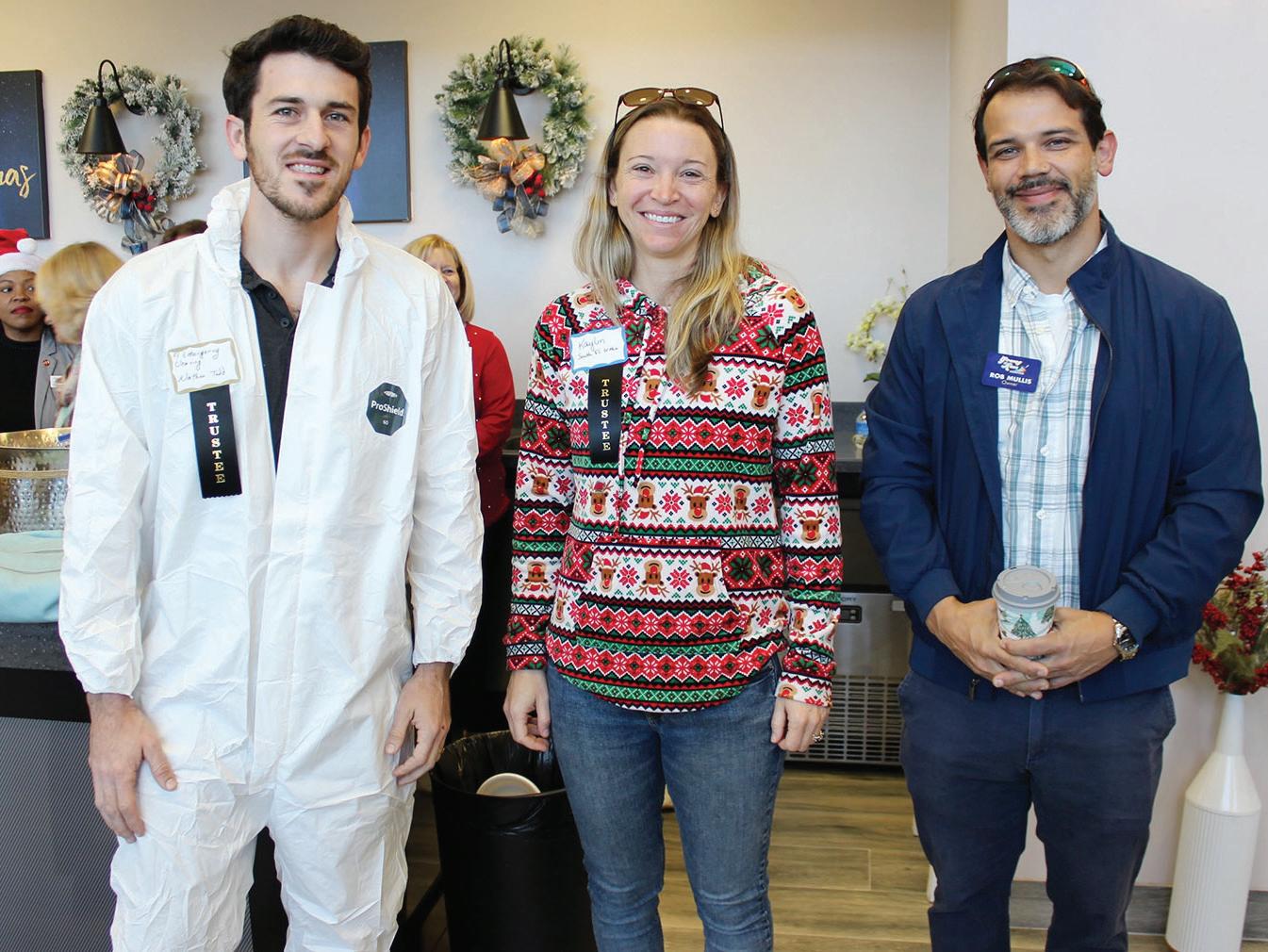 Stuart/Martin County Chamber Trustee Nathan Todd, Florida Emergency Cleaning, left, was dressed to clean as he visited with fellow Trustee Kaylin Obards, South Florida Orthopaedics & Sports Medicine, and Bob Mullis, Groovy Hues, during the Dec. 16 Business B4 Breakfast at The Grace Place.