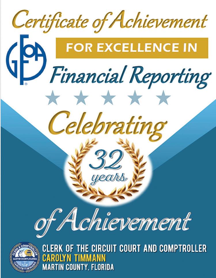 The Martin County Clerk of the Circuit Court and Comptroller is pleased to announce that her office has been awarded the Certificate of Achievement for Excellence in Financial Reporting by the Government Finance Officers Association (GFOA) for its Annual Comprehensive Financial Report (ACFR). This award represents the highest form of recognition in governmental accounting and financial reporting and is a testament to the commitment of the Martin Clerk of the Circuit Court and Comptroller to transparency and fiscal responsibility. This is the 32nd consecutive year the office has received this award. The Certificate of Achievement is awarded to local governments that go beyond the minimum requirements