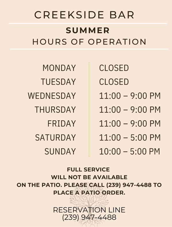 Full Service will not be available on the Patio this summer. To place a food or drink order between the hours above, Wednesday – Saturday, please call (239) 947-4488, and we will gladly bring your order down to you!