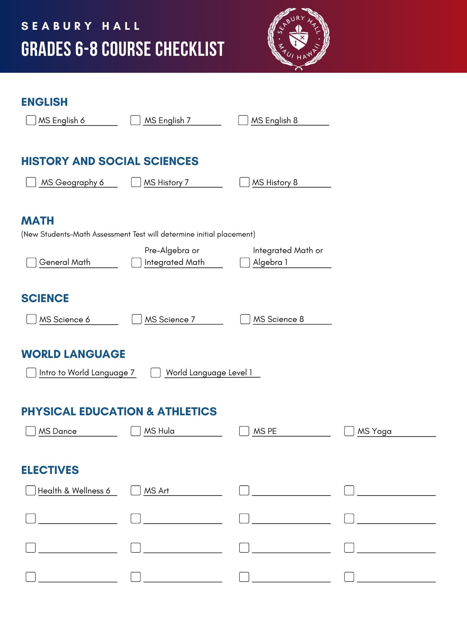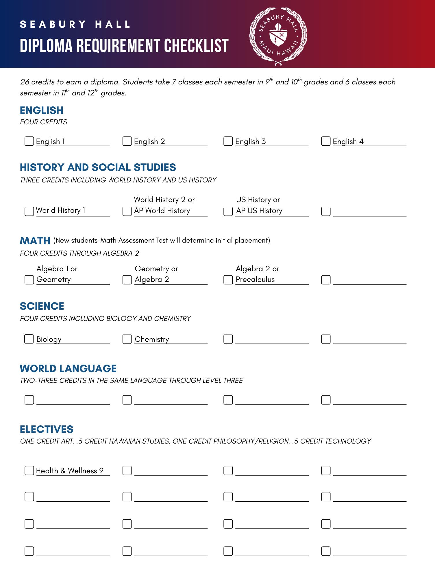 To earn a Seabury Hall diploma, students must obtain at least 26 credits. Each semester a student must carry a minimum of six classes (not including Physical Education), including a minimum of four classes in the following departments: English, History & Social Studies, Mathematics, Religion & Philosophy, Science, World Language, and Advanced Placement courses.