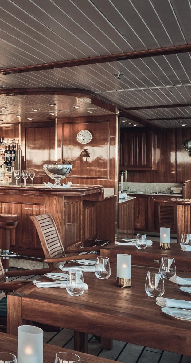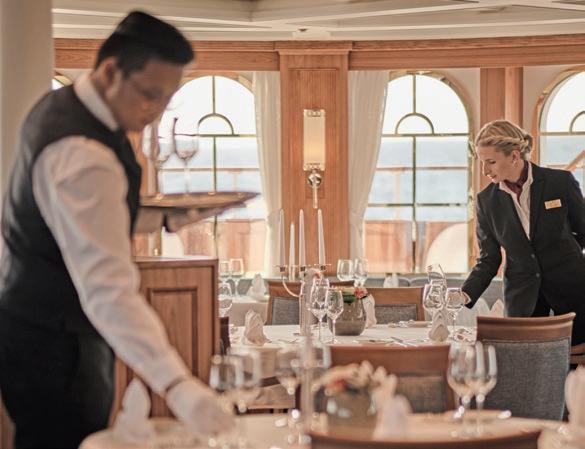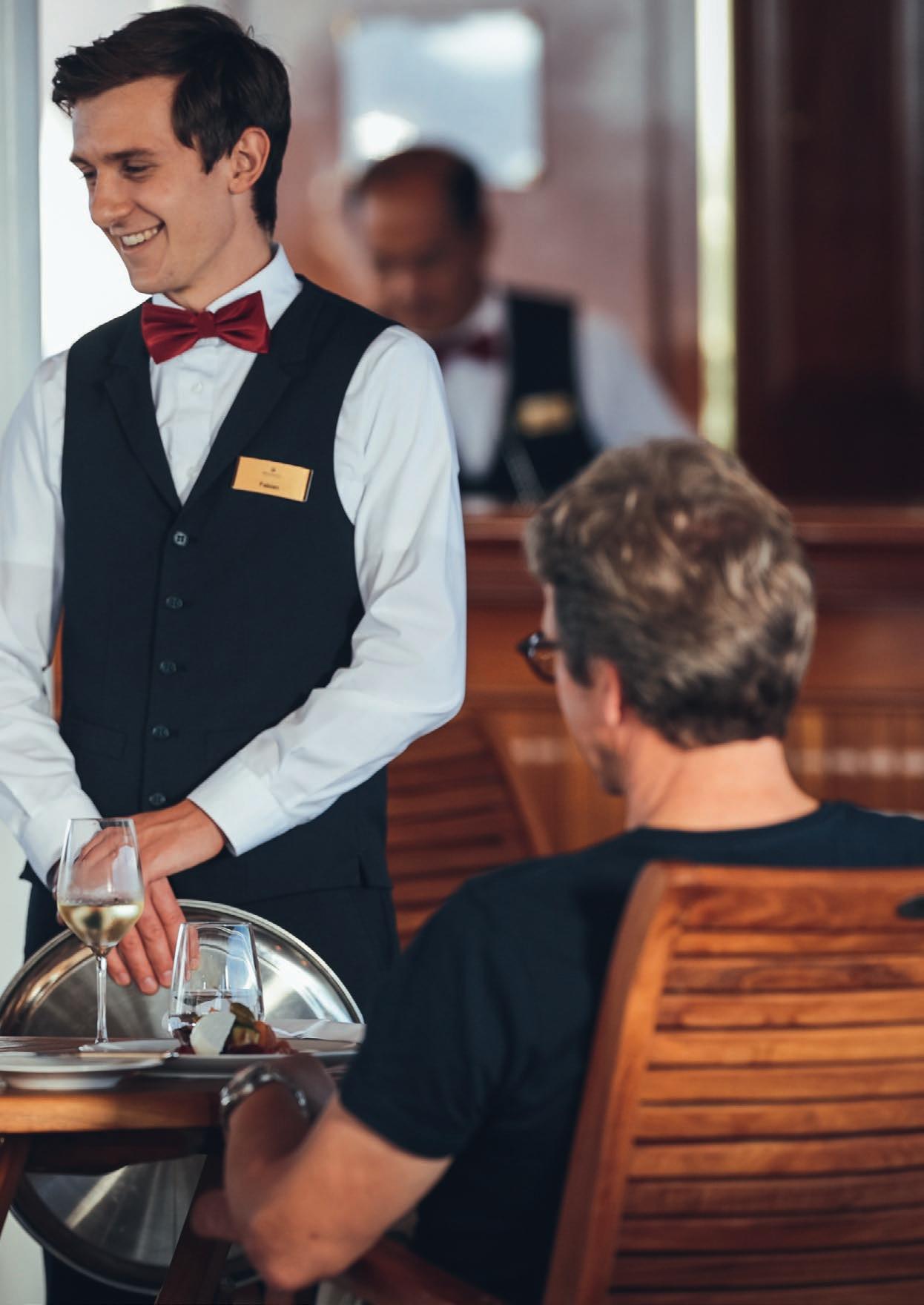 Sie speisen auf unseren Schiffen in einer Sitzung und haben freie Tischplatzwahl. Die Gäste der Suiten 316 bis 318 auf der SEA CLOUD SPIRIT und der 401 sowie 402 auf der SEA CLOUD II dürfen sich Ihren Wunsch-Tisch reservieren. Die Servicezeiten entnehmen Sie bitte dem Tagesprogramm an Bord. Wer entspannt an Deck essen möchte, nutzt auf der SEA CLOUD SPIRIT unseren Bistro-Service auf dem Lidodeck.