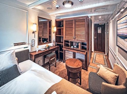 Die beiden Kabinen dieser Kategorie sind das ideale Zuhause für Einzelreisende, die den besonderen Komfort der SEA CLOUD SPIRIT genießen möchten. Auf einem etwas kleineren Raum bieten sie denselben Luxus und dieselbe Behaglichkeit wie die Doppelkabinen auf dem Kabinendeck. Die Bullaugen verleihen auch diesen Kabinen ein überaus maritimes Flair. Besonderheit: Das integrierte Einzelbett überzeugt durch seine bequeme Größe. Mit einer Breite von 110/120 cm am Kopfende bzw. 160/175 cm am Fußende und einer Länge von 220/230 cm sind geruhsame Nächte garantiert.