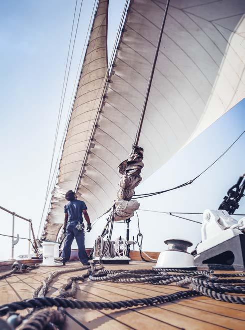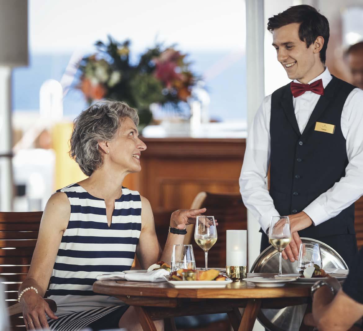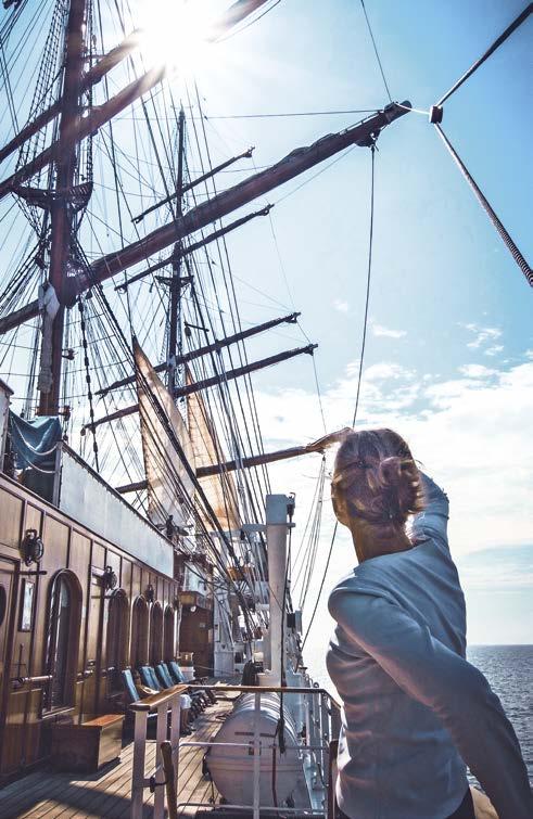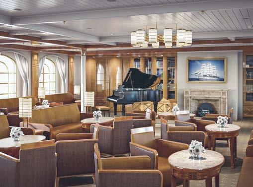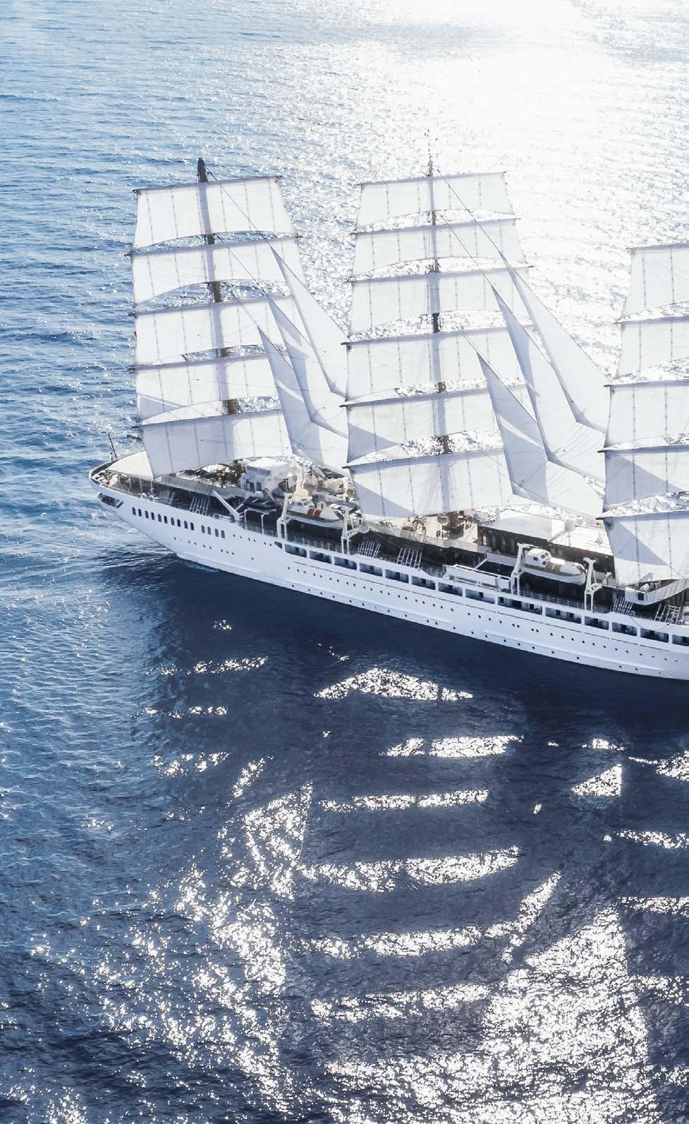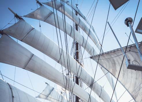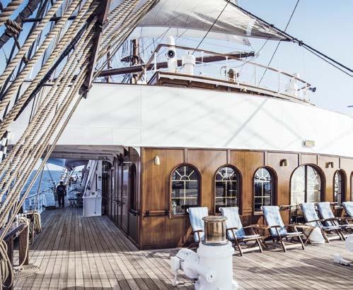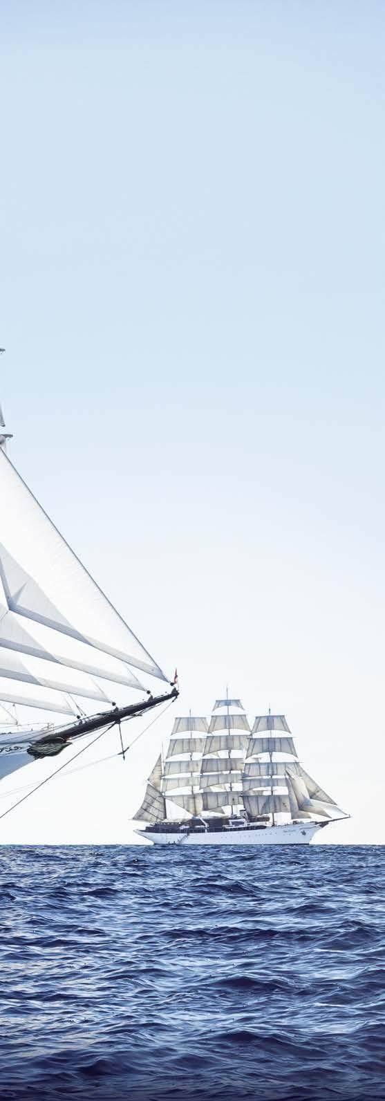Klein und fein, aber doch viele Annehmlichkeiten eines exklusiven Hotels. An Bord unserer Windjammer finden Sie nicht nur ein exzellentes Fine-DiningRestaurant, sondern auch eine hervorragend sortierte Bar, eine Lounge, Bibliothek und Boutique, ein Wellnessund Beauty-Angebot – und auf einem unserer Segler sogar ein Spa mit Sauna und Dampfbad.