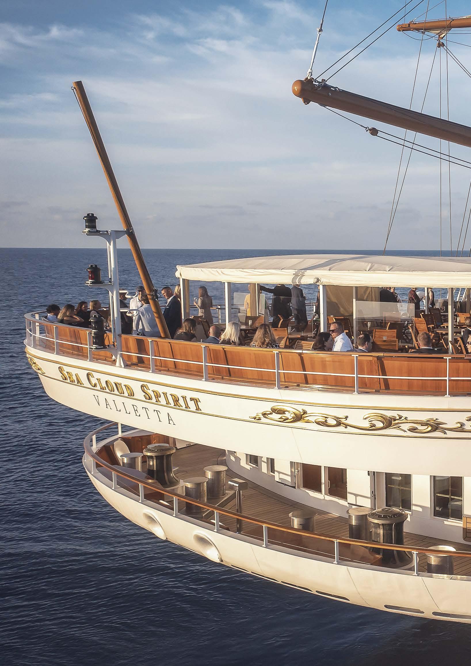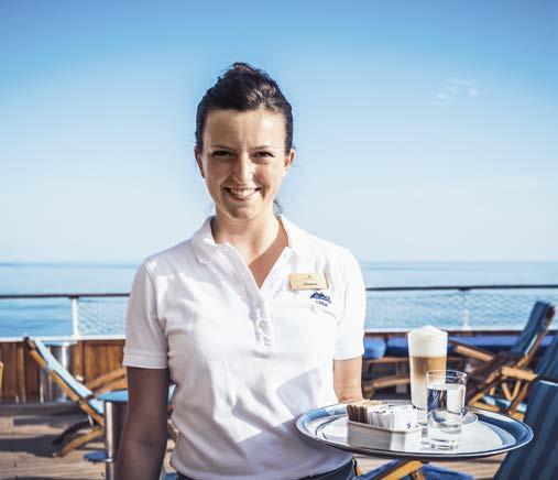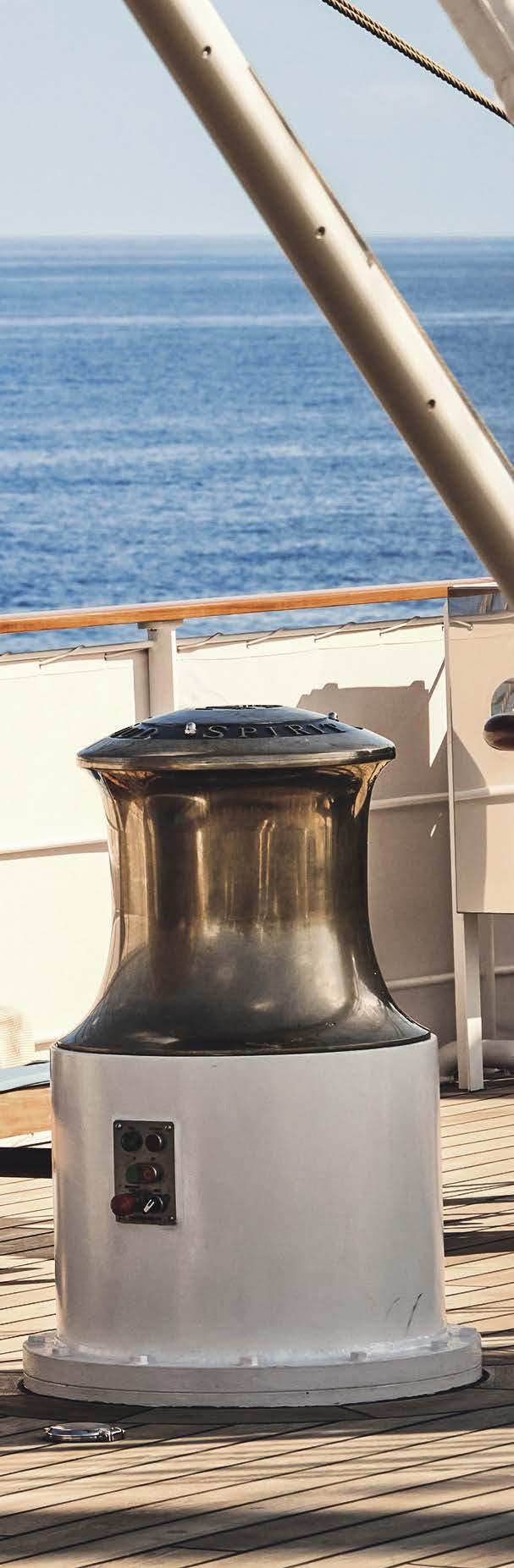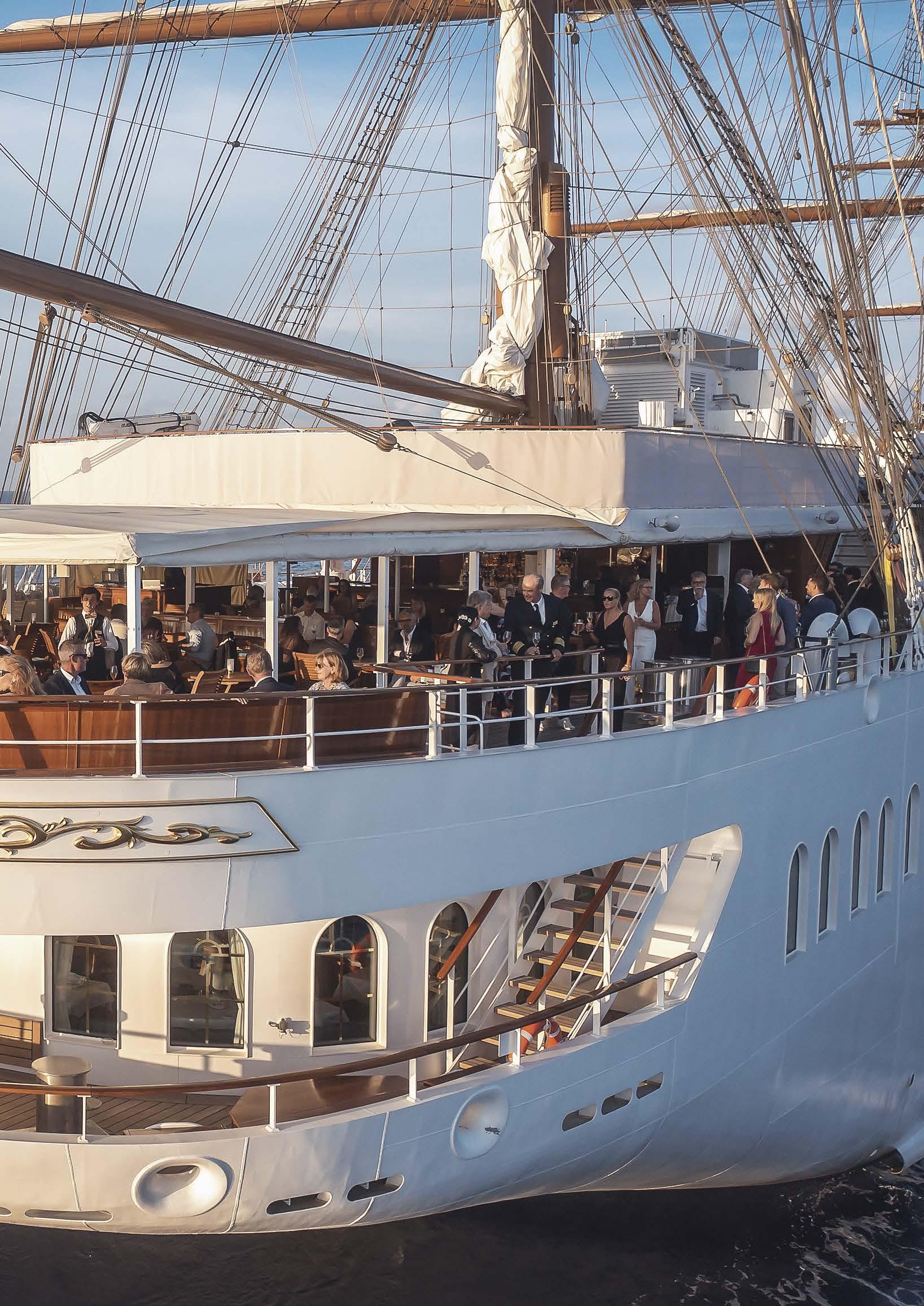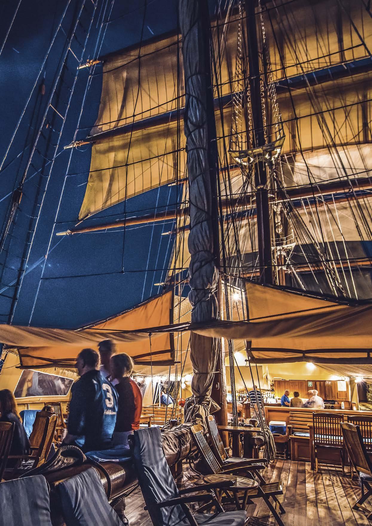 Klein und fein, aber doch viele Annehmlichkeiten eines exklusiven Hotels. An Bord unserer Windjammer finden Sie nicht nur ein exzellentes Fine-DiningRestaurant, sondern auch eine hervorragend sortierte Bar, eine Lounge, Bibliothek und Boutique, ein Wellnessund Beauty-Angebot – und auf einem unserer Segler sogar ein Spa mit Sauna und Dampfbad.