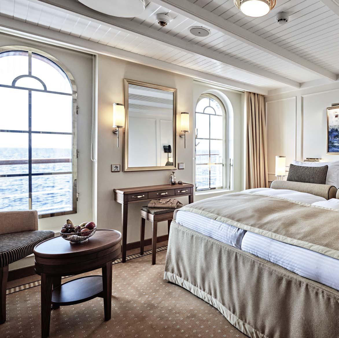 Brauchen Sie etwas Raum für sich? Sehr gerne! Unsere geräumigen, hochwertig ausgestatteten Kabinen sind stilvoll eingerichtete Refugien für Ihre Zeit auf See. Passend zum Meerblick schaffen zeitlos-maritime Details ein elegantes PrivatyachtAmbiente.
