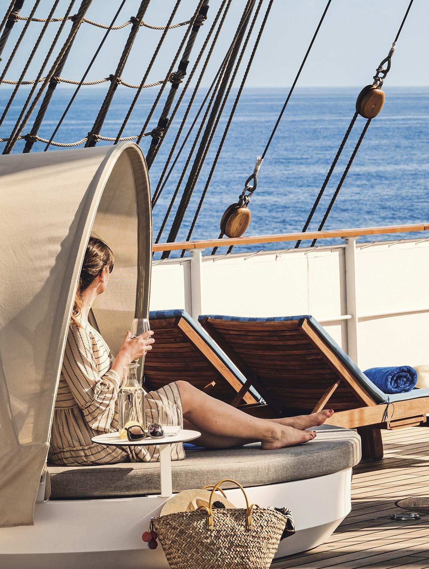 Lassen Sie sich einfach treiben: Auf einer SEA CLOUD finden Sie garantiert Ihren Lieblingsplatz – ob auf dem Sonnendeck, an der Lidobar oder im Deckchair.