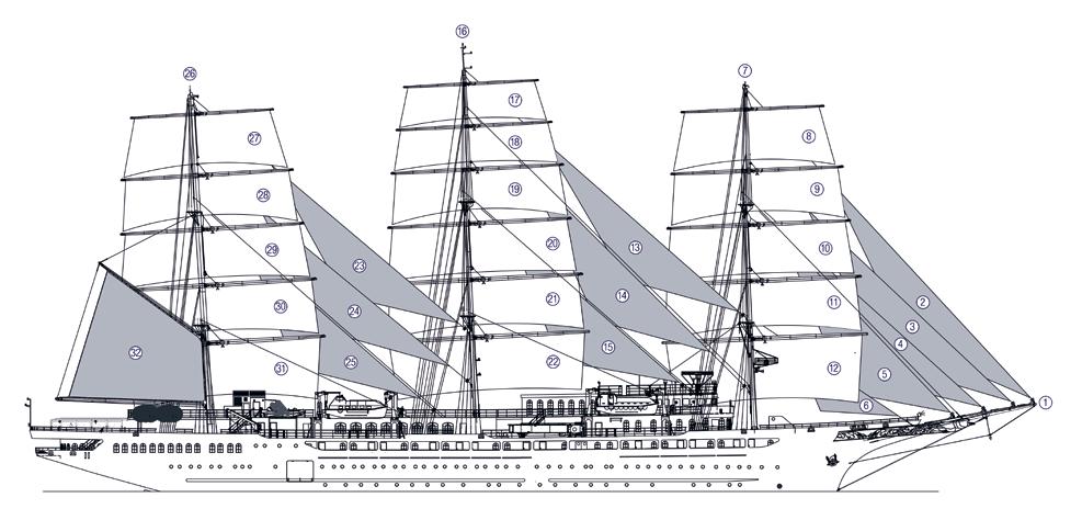 • Drive: 28 sails and 2 diesel-electric drives (2 x 1,700 kW)