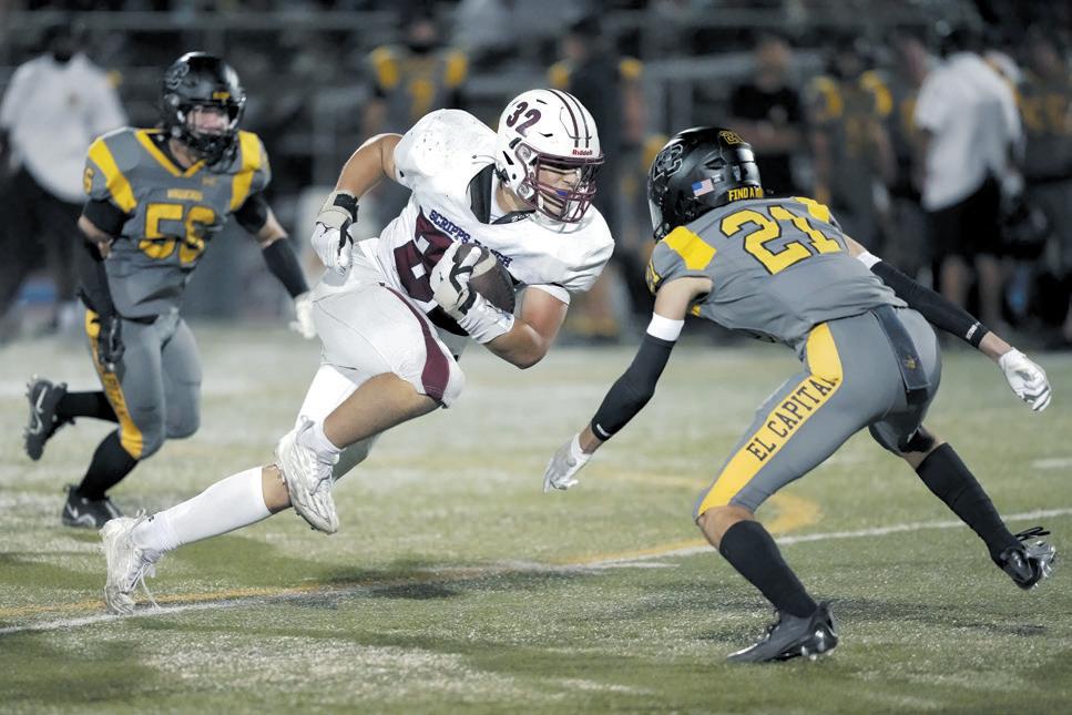 Falcons running back Ryan Stadtherr shoots like a missile through the El Capitan High defense during a 20-7 victory on Aug. 30. SRHS was undefeated 4-0 as of press time. (photo by Jim Wick)