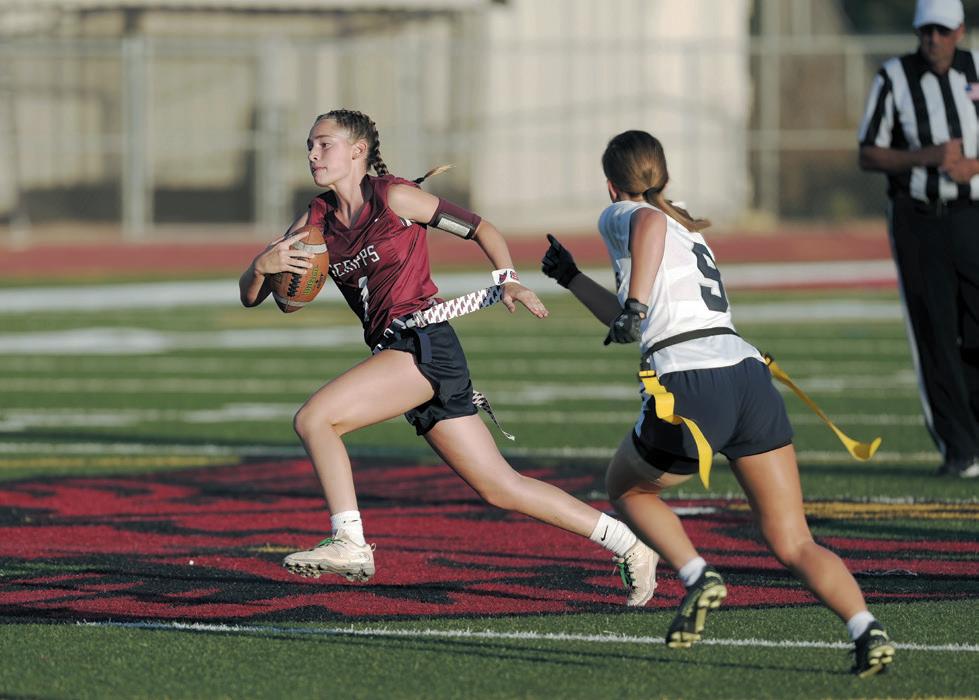 Scripps Ranch High’s Kennedy McCabe strides downfield around a San Marcos High defender during a varsity flag football loss on Sept. 5. (photo by Jim Wick)