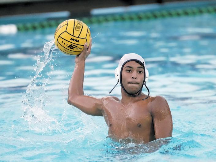 Falcons water polo player Ishan Nahar focuses intensely during action against Steele Canyon High on Sept. 6. (photo by Jim Wick)