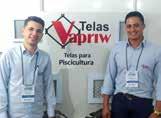 A Telas Vapriw apresentou telas especiais para a aquicultura: a tela de inox e a tela revestida com pvc autoaderente. “É um revestimento especial que não descasca com facilidade, trazendo mais durabilidade ao tanque e maior custo benefício ao produtor”, explica o diretor da empresa, Wellington Dornelas, ao lado de Adriano Rodrigues Cesco.