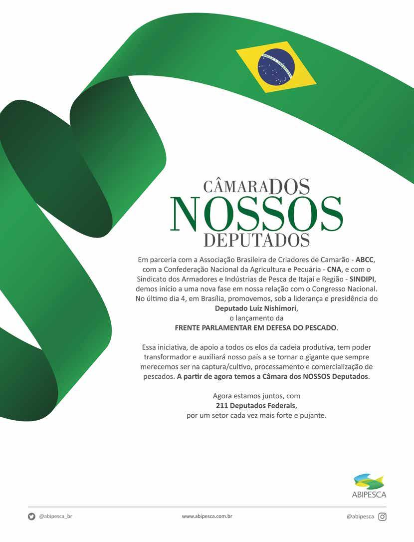 Nishimori tem no setor privado fiadores como a Associação Brasileira da Indústria de Pescados (Abipesca), Confederação Nacional da Agricultura (CNA), Sindicato dos Armadores e das Indústrias da Pesca de Itajaí e Região (Sindipi) e Associação Brasileira dos Criadores de Camarão (ABCC), que em um jantar realizado em 04/06 em Brasília reforçaram junto aos deputados e senadores os pleitos do setor. Nesta entrevista abaixo, Nishimori já fala como integrante do universo do pescado e prevê convívio com uma outra iniciativa criada pelo deputado federal Cléber Verde (PRB-MA) em março: a Frente Parlamentar Mista de