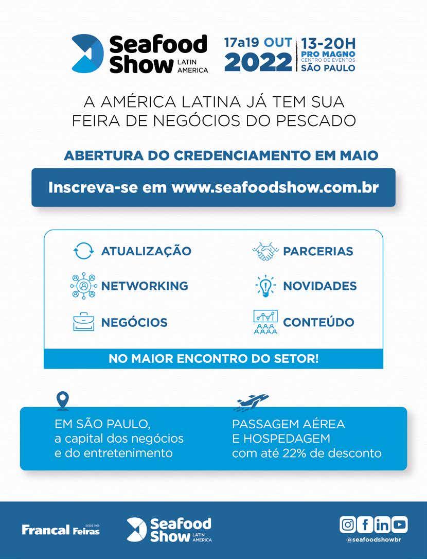 termômetro ideal da ascensão. O gestor de agronegócio da ApexBrasil, Alberto Carlos Bicca, confirma. “Eventos como a Seafood nos permitem ganhar mais visibilidade e reconhecimento e explorar mais opções do mercado internacional. A longo prazo, esperamos uma contínua internacionalização e exposição dos pescados brasileiros. Será possível alcançar US$ 1,5 bilhão de exportações para os Estados Unidos”, prevê. O stand da ApexBrasil representou o ponto de encontro para a delegação brasileira no evento, que contou com 17 empresas e instituições abrigadas no espaço.
