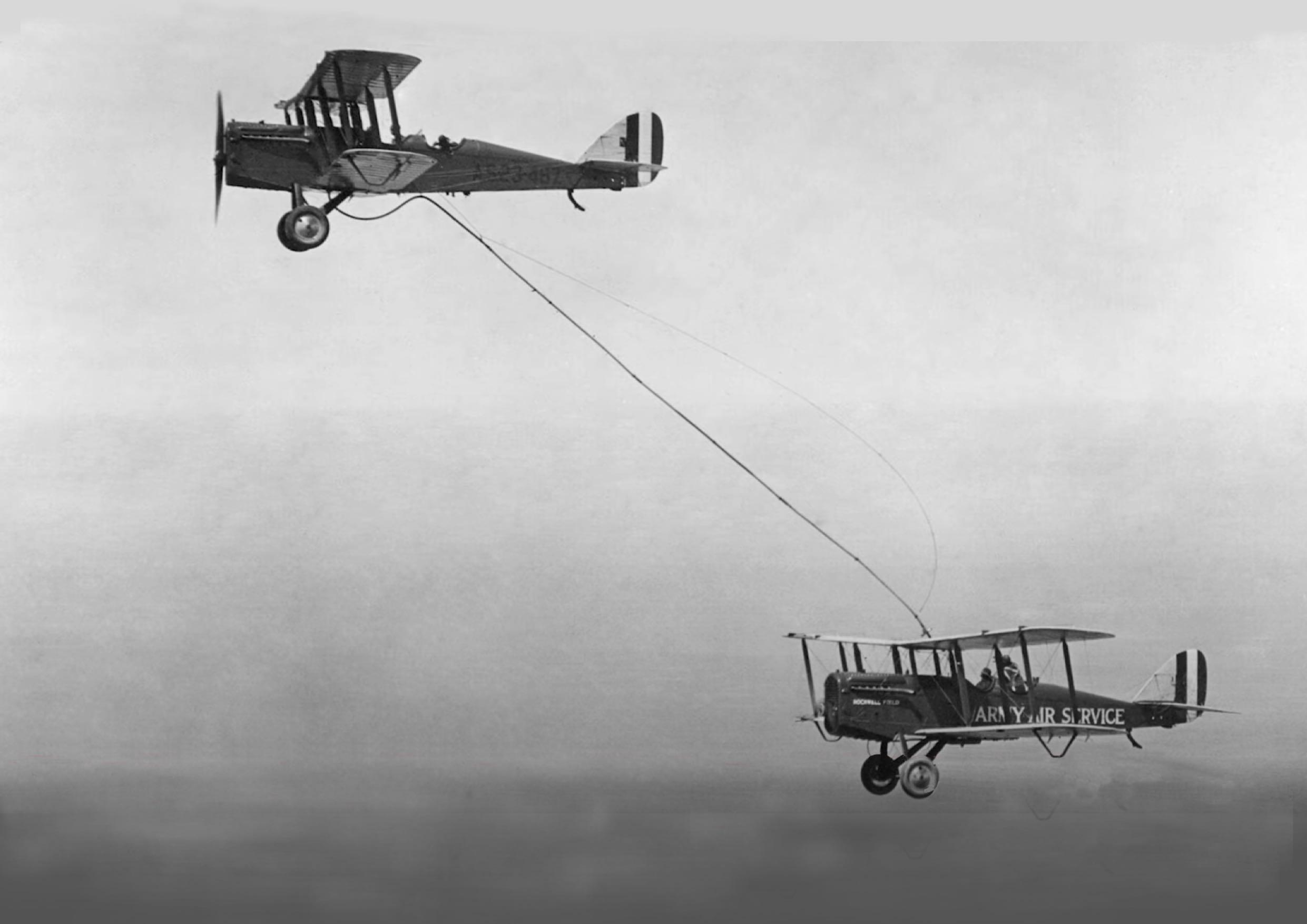 Right [2] The next iteration didn’t occur until October of 1920 when Lieutenant Godfrey Cabot of the US Naval Reserve swooped low over the Potomac River trailing a grappling hook to snag a file gallon drum of gasoline. Although it was a modest amount, the event marked the first more practical means of an aircraft extending its range by aerial refuelling.