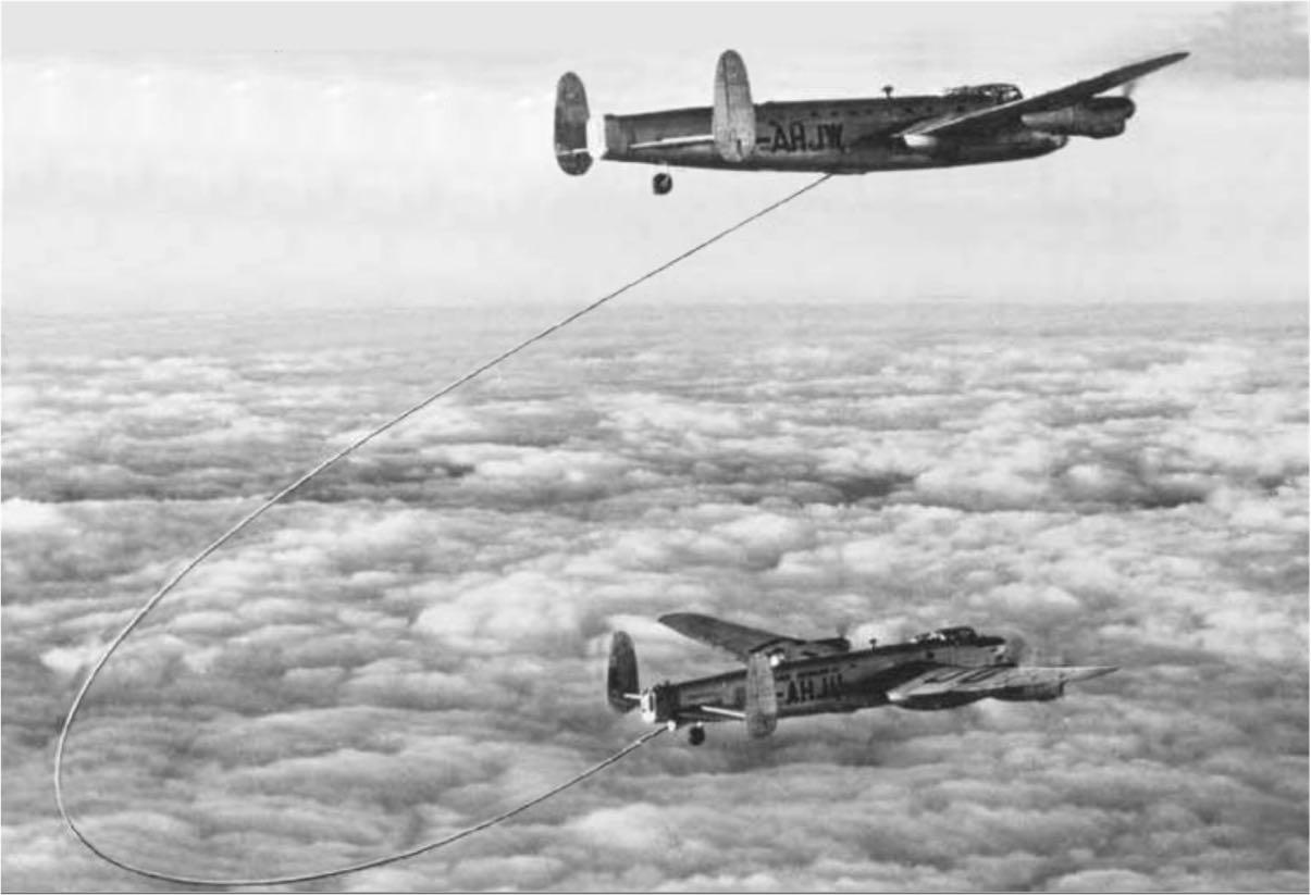 Photo: Lancaster G-AHJW refuels GAHJU, using the “Looped Hose” refuelling method.✈