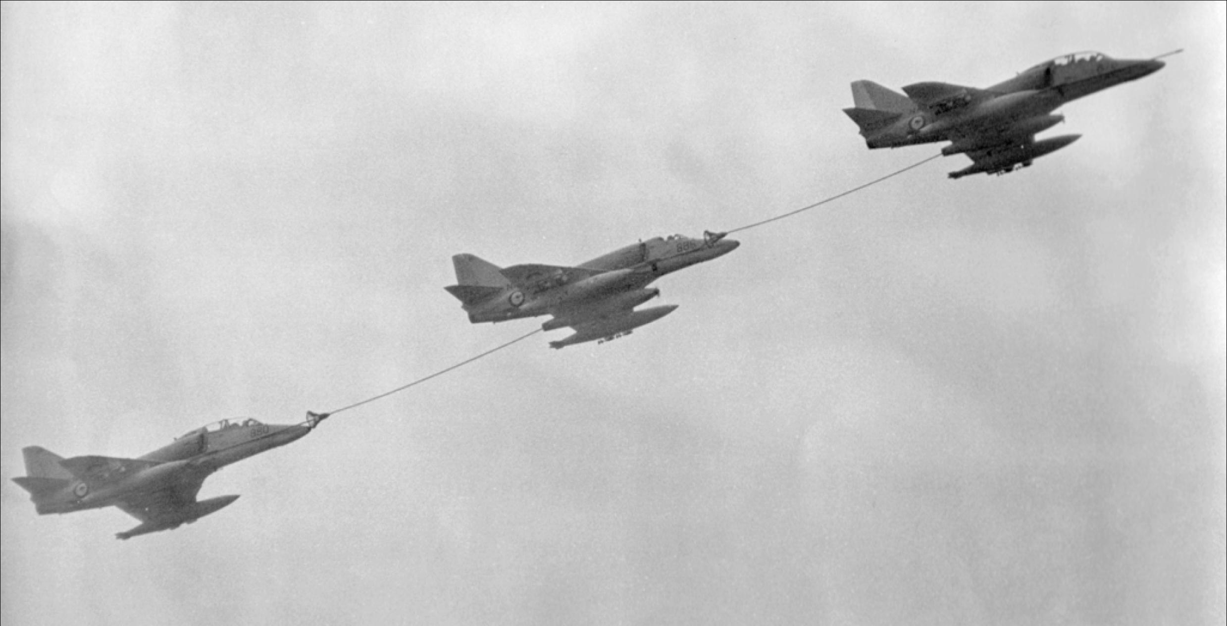 Whilst in-flight refuelling had now reached a mature state, a significant weakness remained: it required a dedicated tanker aircraft that was expensive, vulnerable and, crucially, was completely impracticable for operations with deployed Carrier Air Groups operating far from home base. The ‘Buddy Store’ was the answer: an external pod fitted to an aircraft hard point that contained disposable fuel and a hose and drogue system. The Buddy Store allowed practically any platform to become a supply aircraft: indeed, even the little Skyhawk A4 could quickly be fitted with the store to become ‘buddy refuellers’, thus vastly expanding the range and flexibility of the capability. Above: Skyhawk 887 aboard HMAS Melbourne with the central ‘buddy’ refuelling store and a drop tank under each wing. Note also the ‘bent’ refuelling probe on the nose. These were originally straight, but were modified during the aircrafts’ life to minimise the risk of ingesting fuel into the starboard engine intake.✈