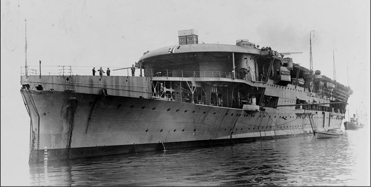 Above. Furious in her 1939 fourth and final iteration. The lower flying off deck forward is no longer used and has 4” guns mounted, while the main flight deck has been extended aft. Overwhelmed dockyards and bean counting meant that the new starboard side island, now topped by a homing beacon, did not contain the funnel trunking considered de rigueur by naval architects since 1924. When VAT Smith took 807 Squadron aboard in 1941 they still had to contend on final approach with turbulence from the funnel gas being exhausted aft. Furious survived the war and was decommissioned in 1945 and scrapped.