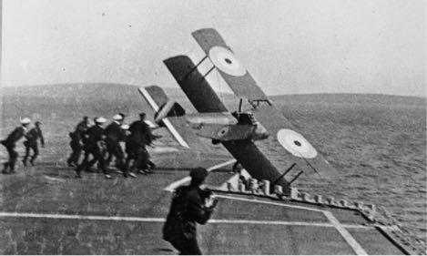 Top: Furious post June 1917 - her first iteration, with the aft turret intact but a flying-off deck replacing everything forward of the superstructure. Middle: August 1917. Edwin Dunning makes the first ever deck landing aboard Furious by side-slipping his aircraft to align it with the flying-off deck. His arrester mechanism consisted of companions from the Wardroom grabbing parts of the airframe.. Dunning was killed a few days later (Lower) on another landing attempt, when he plunged over the side and was drowned. A ship’s report suggested recovering to the forward deck could be done, but the life expectancy of each pilot would be ten landings. ✈