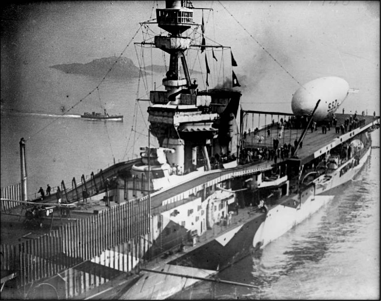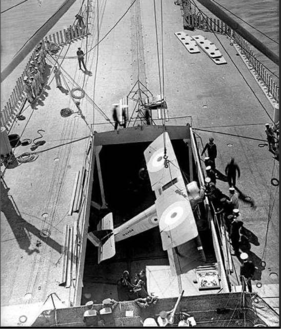 Removing Furious’s forward 18” turret a hangar was constructed with a sloping flight deck above. Aircraft were lifted by electric derricks through a hatch onto the flight deck for a free take-off by wheeled aircraft, or sitting on a reusable trolley along a fixed track if a floatplane. The tactical concept was for the the oilfired steam turbine powered Furious to remain with the main battle fleet launching her wheeled Sopwith Pups and Short 184 floatplanes for reconnaissance, antiZeppelin patrols and gunnery spotting. The obvious catch was those aircraft could not land back on but would be recovered by a slower following seaplane carrier such as Nairana, or ditch (if a Pup) near a destroyer.