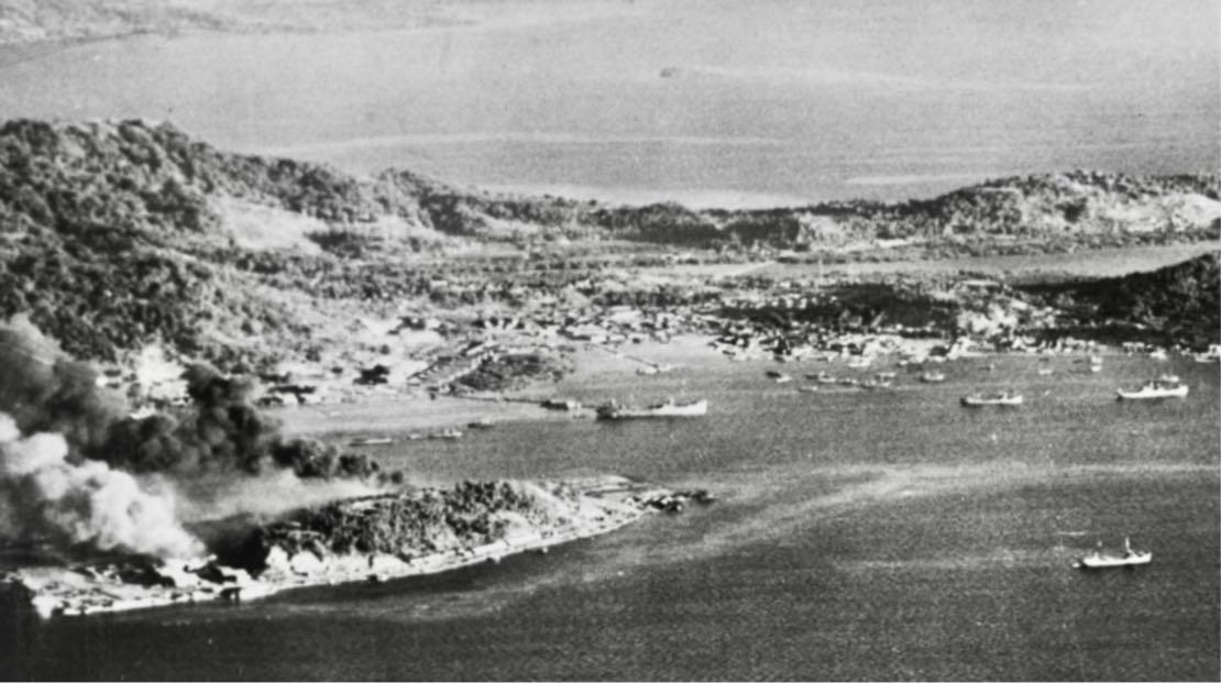 [1] The author (L) and Peter Jones on what was once the apron area of an air station on Ponam Island, b but is now the primary school. [2] The Admiralty Islands comprise about 160 small islands, the principal ones of which are Manus and Los Negros, located about 160nm north east of mainland PNG. Australian mandated territory in 1942 they were occupied by the Japanese and had to be recaptured in a series of costly battles. Once in allied hands, the Americans built airfields on some of them, the one on Ponam Island becoming British in 1945. [3] Airfield on Eten Island burning at left, as seen from a USS INTREPID (CV-11) aircraft on the first day of strikes, 17 February 1944. Dublon Island and town is in the middle background, with several merchant ships offshore, and one large tanker alongside the fuel pier in left centre. See next page for what it looks like now. ✈