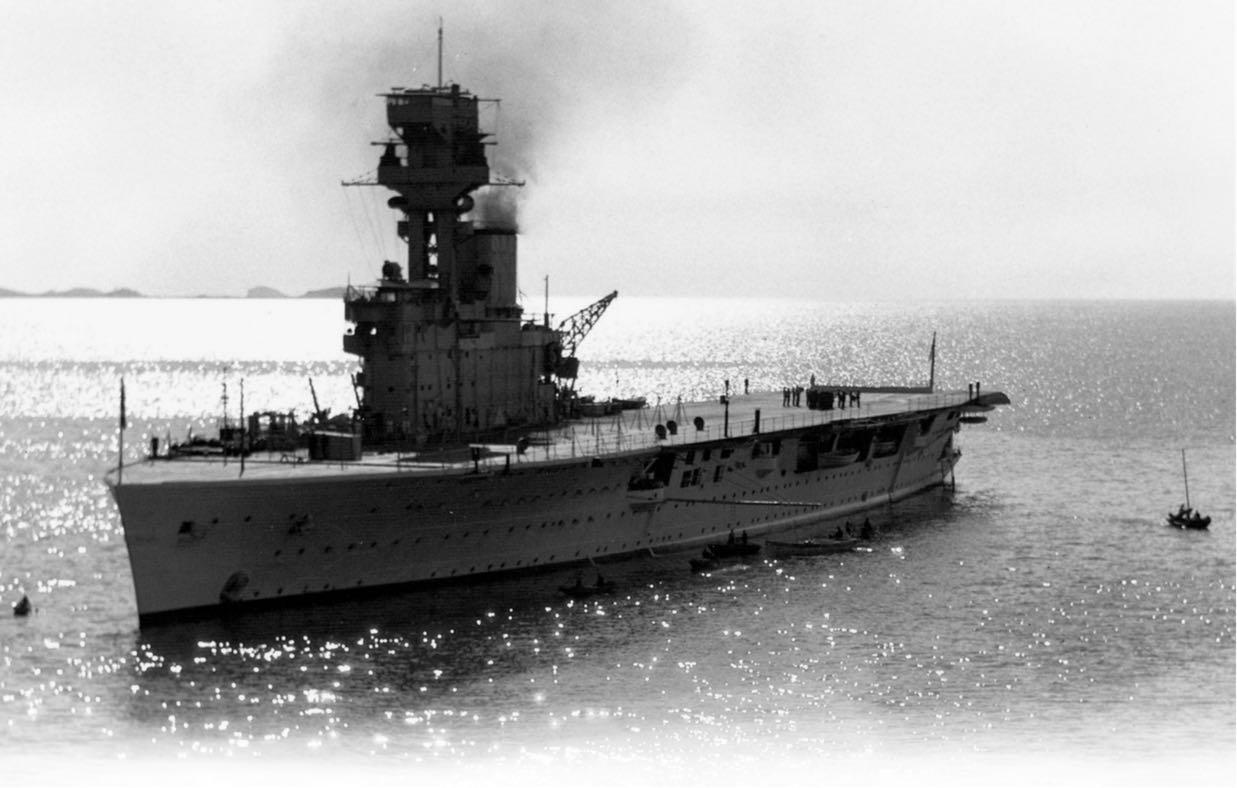 in 1924. Commissioning as fleet carriers in 1928 and 1930 both had gained flush-decks above a double hangar with a starboard side island and short lower flying-off platform forward. This was accessed from the upper hangar and improved launch and recovery cycles. By the mid 1930’s they had also gained transverse arrestor gear and hydraulic accelerators.