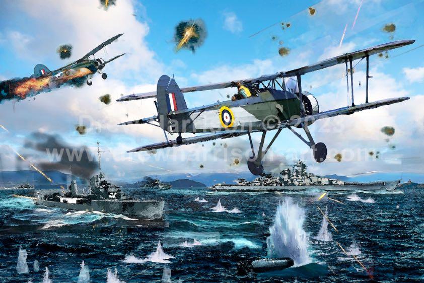 Although the actual torpedo drop point would have been from 50 feet at 1000 yards the painting shows the aircraft slightly higher to allow it to stand out prominently against the light blue sky. Since the strike was at the maximum range of 240 nm for a torpedoarmed Swordfish, it was assumed all flare shackles and hard points were empty to reduce weight, as can be seen in later photographs of aircraft ‘torpedoed up’ at Hatston.