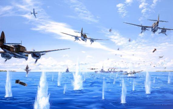 When I suggested illustrating this action, Peter recommended Drew Harrison as an outstanding Australian aviation artist. Looking at his website my eye was drawn to the sense of motion and danger Drew had achieved in his artwork titled ‘Combined Strike’, now in the South Australian Aviation Museum collection.DepictingatorpedoattackbyNo.100 Squadron RAAF against a Japanese cruiser and destroyer, it was the cover art for that squadron’s history, ‘Song of the Beauforts’ by Colin King. [Picture 1].